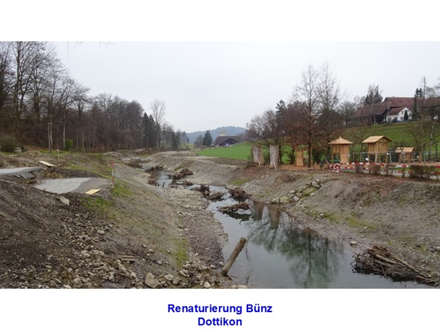Die Bünz war bis zum Hochwasser von 1999 kanalisiert. Sie wird seither schrittweise revitalisiert und darf wieder mäandrieren. Das Bild zeigt den Abschnitt des Projektes der Revitalisierung bei Dottikon.