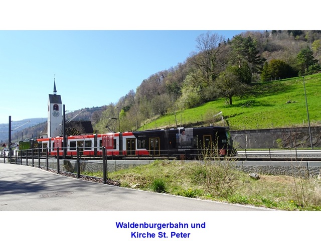 Wanderweg, Vordere Frenke und Bahnlinie verlaufen heute praktisch parallel. Ständig sehe ich, wie die Waldenburgerbahn hin und her fährt, die die Orte des Waldenburgertals erschliesst. Auf dem Bild hinten ist die Kirche St. Peter unterhalb von Oberdorf zu sehen.